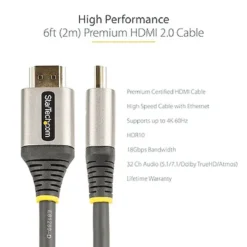 - ESPECIFICACIONES: 2 metros | HDMI 2.0 | Cable HDMI Premium | Cable de alta velocidad con Ethernet | HDMI macho a macho | Diámetro exterior de 6 mm, 30AWG| Cubierta: TPE | Escudo EMI: Lámina de Al-Mylar, trenzado | Garantía de por vida StarTech.com