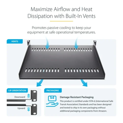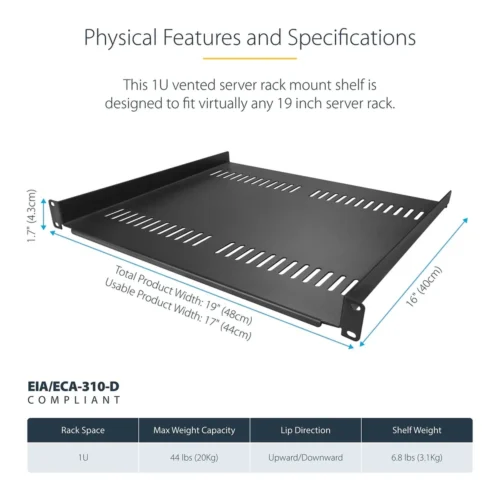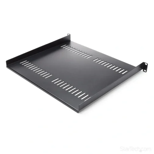 Esta bandeja 1U de armario para racks le permite agregar 40cm de espacio plano de almacenamiento en cualquier rack o armario compatible con EIA-310. El estante tiene aberturas de ventilación para permitir la circulación de aire y disipar las temperaturas de su rack.