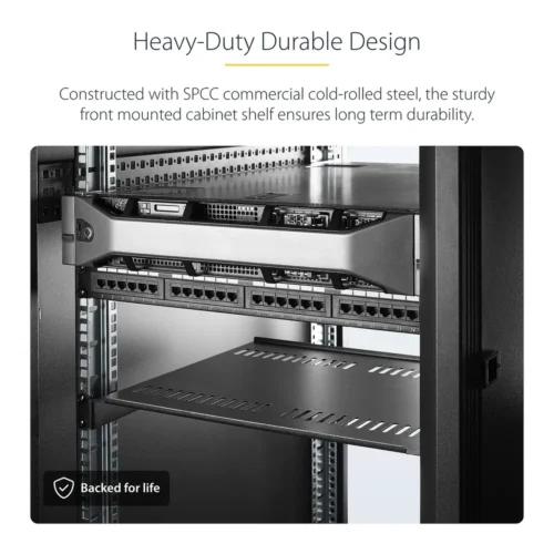 Fabricado en acero comercial laminado en frío SPCC, el estante para racks de montaje frontal garantiza la durabilidad a largo plazo y soporta un peso total de 20 kg, convirtiéndolo en la solución ideal para cualquier entorno